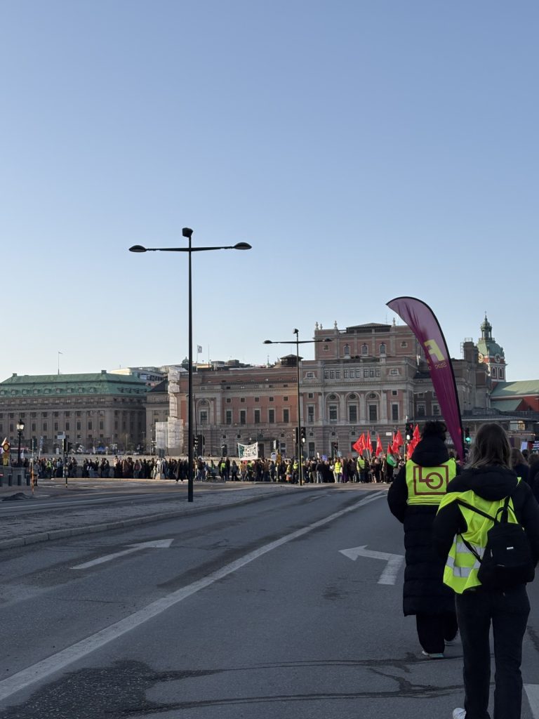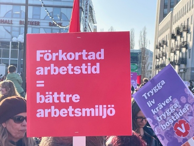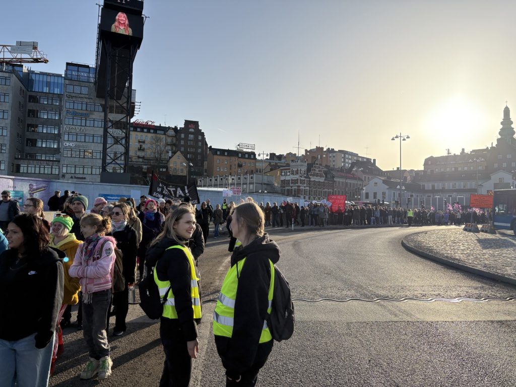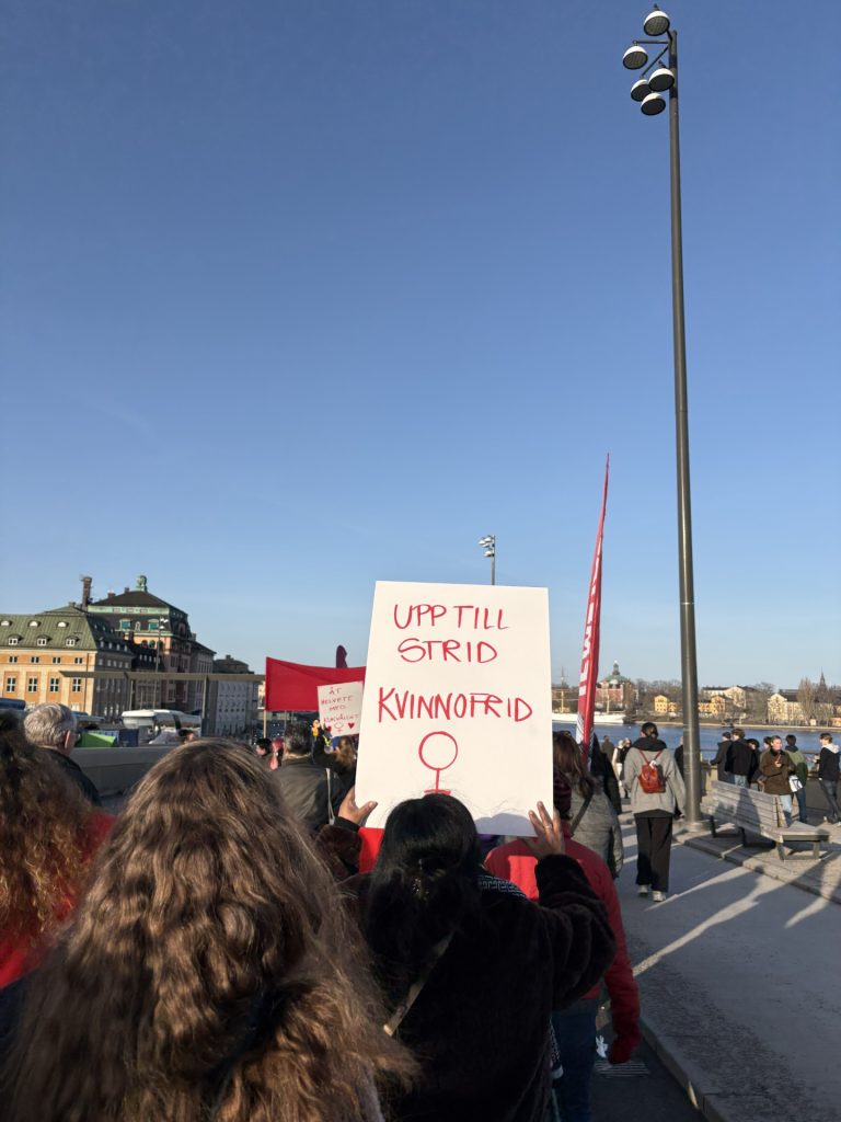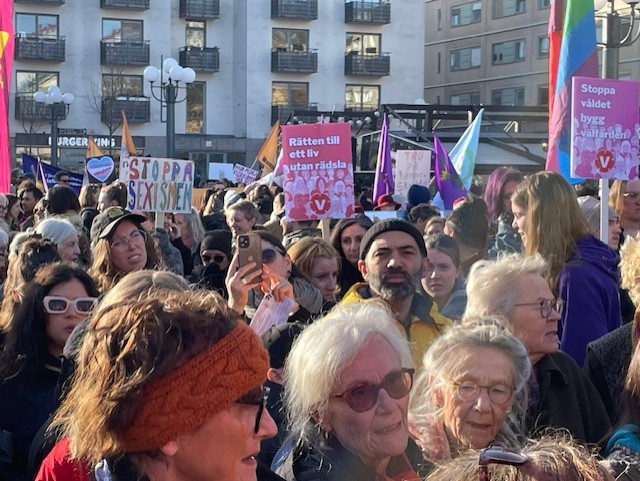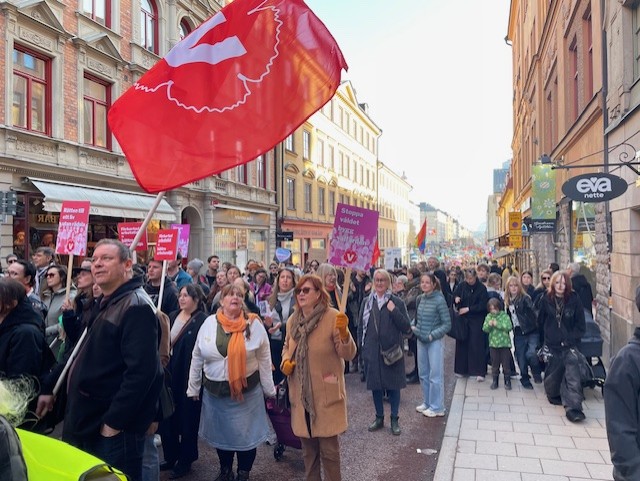 ”8 mars i Stockholm, i tusental med talkörer som ”Hela lönen, halva makten – vi slår inte av på takten!”, ”Internationell solidaritet – arbetarkvinnors kampenhet”, ”Inga sexister på våra gator” och många fler med tusentals röster. 8 marskommitten arrangerade med Vänsterpartiet, Ung Vänster, LO-distriktet, SSU, Feministiskt Initiativ, Grön Ungdom och Miljöpartiet mfl i leden. Iranska ”Kvinnor, Liv, Frihet”, fackliga metallare och kvinnojourer i unga, brokiga optimistiska grupper rakt emot tidens krigshetsare och högerextrema. Löftesrikt solsken på 8 mars mot mörkertider.”