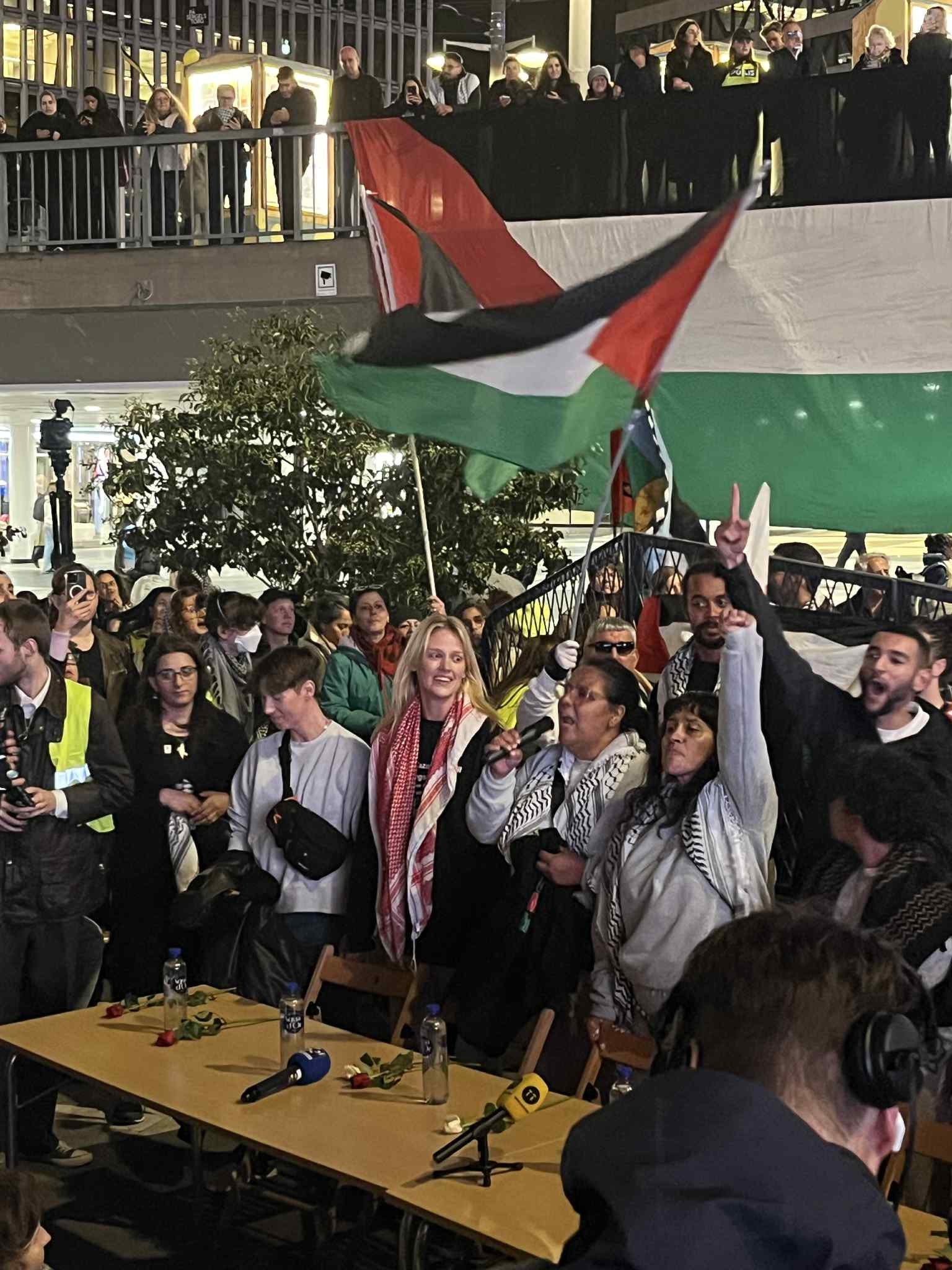 Global Movement to Gaza Sverige hade ordnat en pressträff på Sergels torg där de svenska aktivisterna berättade om resan med Global Sumud Flotilla och svåra upplevelser i israelisk fångenskap.