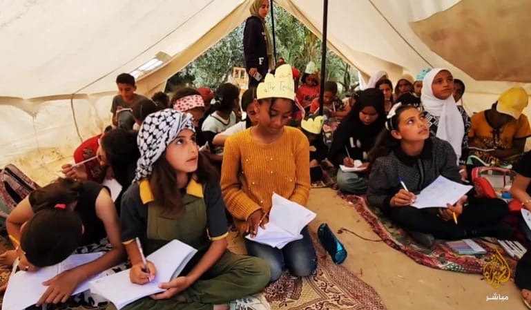 I takt med att krisen fördjupades och förstörelsen spred sig tvingades utbildningsministeriet att upprätta vad som kom att kallas ”utbildningstält”, tillfälliga center som sattes upp i flyktingläger och de mest förstörda områdena, i ett desperat försök att skapa en säker inlärningsmiljö för barn som hade förlorat sina hem och skolor i de obarmhärtiga bombningarna. Men trots den ädla ansträngningen har dessa tält haft begränsad effekt, mött en allvarlig brist på lärare och utbildningsmaterial och endast erbjudit de mest grundläggande ämnena, allt under förhållanden som ligger långt under någon acceptabel inlärningsmiljö.