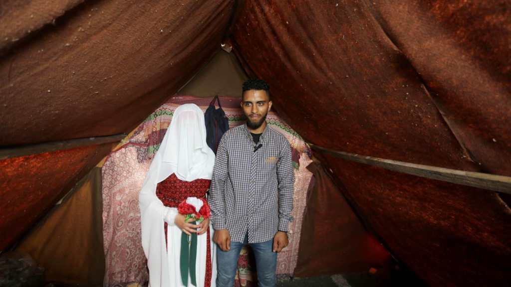 Bruden och brudgummen, som har bott med sina familjer i lägret i över tio månader efter att ha flytt från Gaza City under israeliskt bombardemang, valde att inte vänta på att kriget skulle ta slut. Istället förvandlade de sitt bröllop till en strimma av hopp för sin omgivning, ett budskap om att livet fortfarande är möjligt, även bland ruinerna.