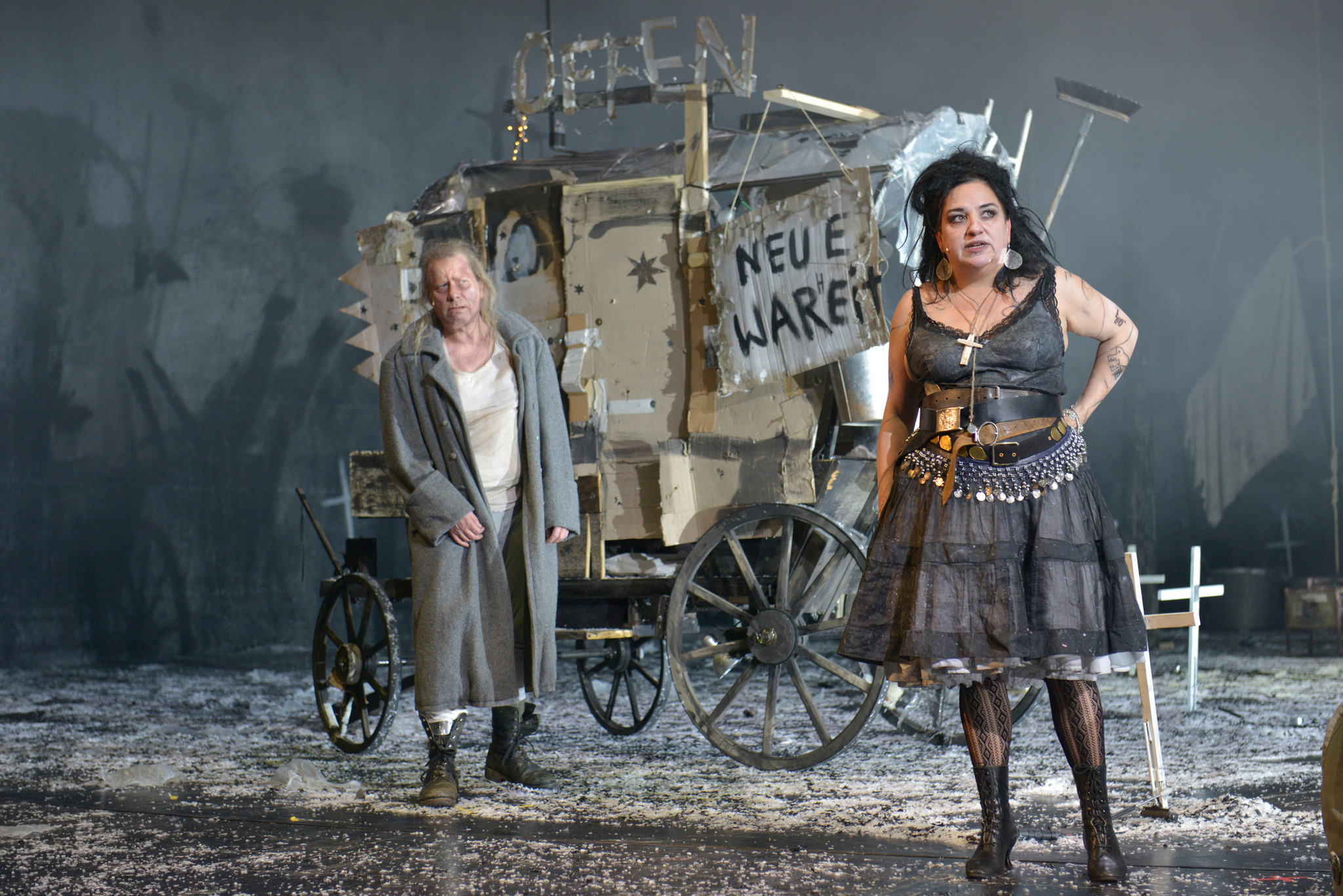 Bild från föreställningen Mutter Courage und ihre Kinder på Burgtheater i Wien 2014. Det borgerlig-kapitalistiska samhällets ”dramatiska kurva” – enligt Brecht.