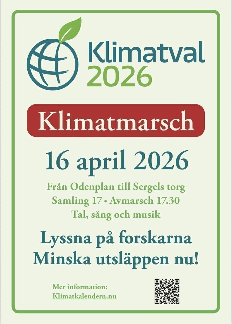 Golfströmmen kollapsar snart om vi inte börjar binda kol i skog, mark och alger mm. En snabbare omställning är redan på gång globalt men vi har bråttom. Du, vi, alla behövs för att stoppa eländet med de fortsatta utsläppen. Den 16 april görs en kraftsamling på Stockholms gator. Då arrangeras klimatmarschen Klimatval 2026. Alla stora klimat- och miljöorganisationer står bakom, och även många andra aktörer.