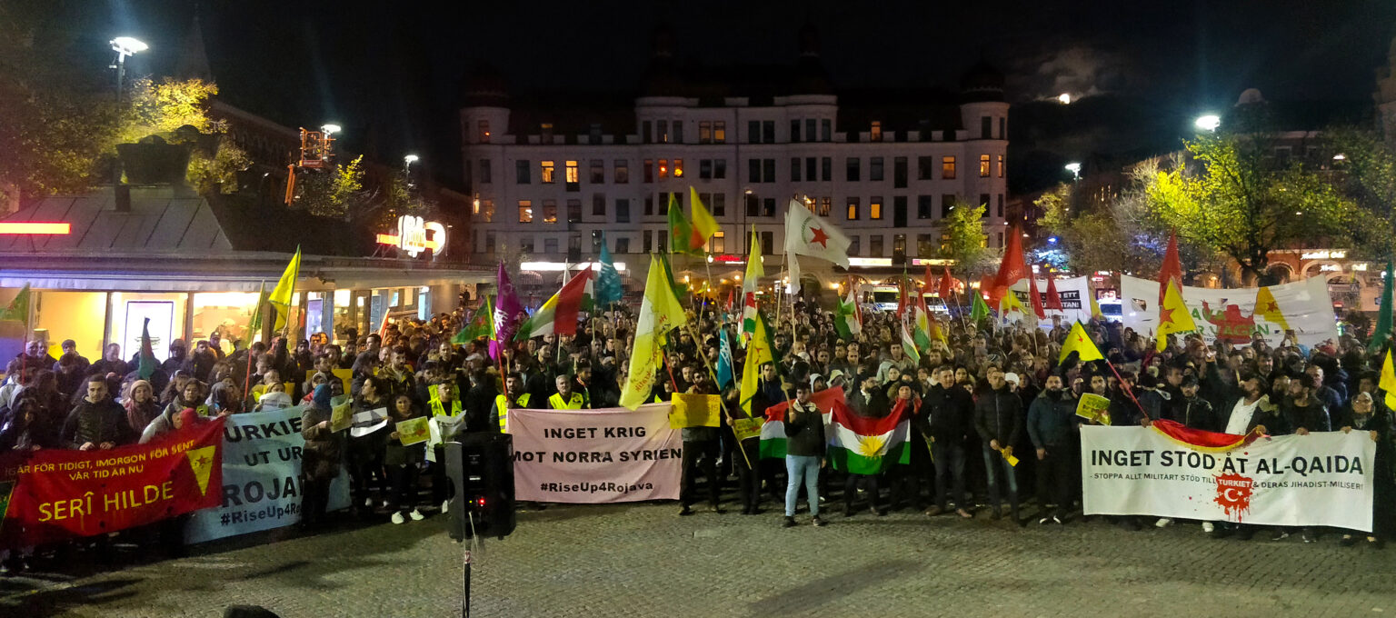 Bild: demonstration på Sergels torg i Stockholm anordnad av Rojavakommitteerna som protesterar mot att det nya islamistiska HTS-styret i Syrien får ett utökat bistånd på 295 miljoner kronor från Sverige. Två moderata ministrar har också nyligen gjort en hemlig resa till HTS högsta ledning. De gjorde då ett uttalande om att samarbetet med HTS-styret syftar till att ”öka återvändandet till Syrien”.