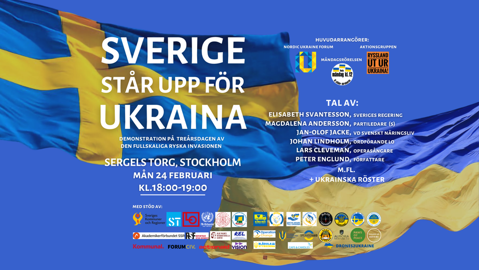 Stora delar av svensk fackföreningsrörelse, från LO till tjänstemannafack tillsammans med Sveriges kommuner och regioner, Svenska FN-förbundet, Olof Palmes Internationella Center och mängder av volontärorganisationer stödjer manifestationen där både Tidöregeringens Elisabeth Svantessons och S-oppositionens Magdalena Andersson talar tillsammans med LO:s ordförande Johan Lindholm och Svenskt Näringslivs VD Jan-Olof Jacke medan ukrainska röster framträder ”i sång och tal”.