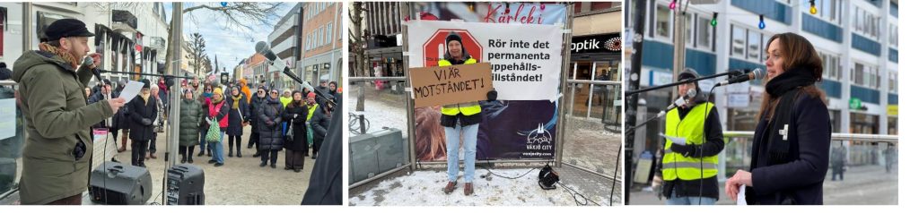 När vi krokar arm, då är vi starka. Det var budskapet från Växjö på lördagen mot regeringens utvisningspolitik. Arrangörer var ”Goda krafter för ensamkommande Växjö”, ”Amnesty grupp 24” och ”Innergården Solidaritet”. Bland talarna fanns företrädare för både Vänsterpartiet och Miljöpartiet. Här är Robert Armblads manande ord.