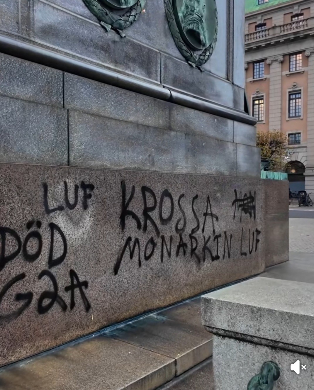 I filmen står en ung kvinna framför ett monument där någon klottrat ”Död åt G2A” (Gustav II Adolf), ”Krossa monarkin” och ”LUF”. Flera gånger påstår hon att det ska vara LUF som ligger bakom.