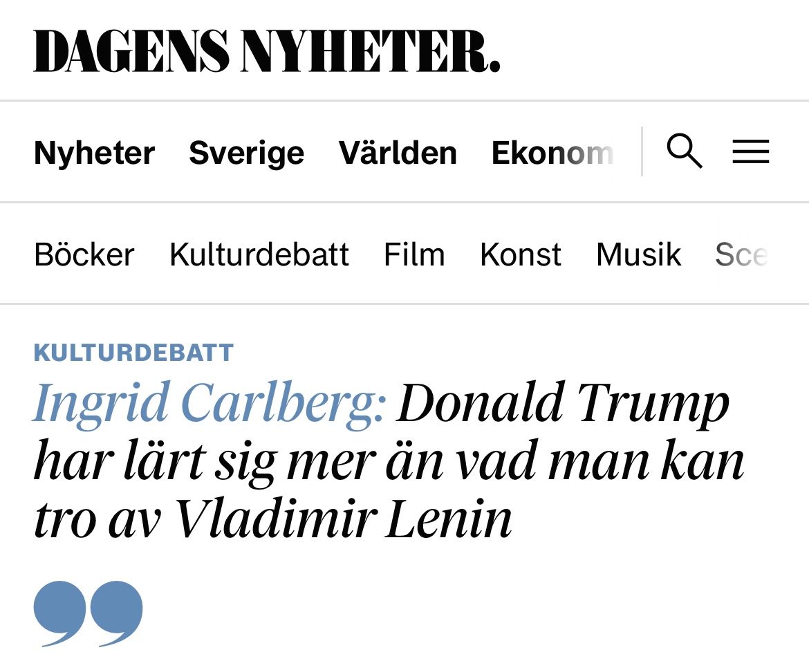Ingrid Carlberg har en annan uppfattning. All ondska kommer ifrån – och har sitt ursprung i – vänstern. Trump hade inte varit möjlig utan Lenin. Är Lenin bakom Putin också?