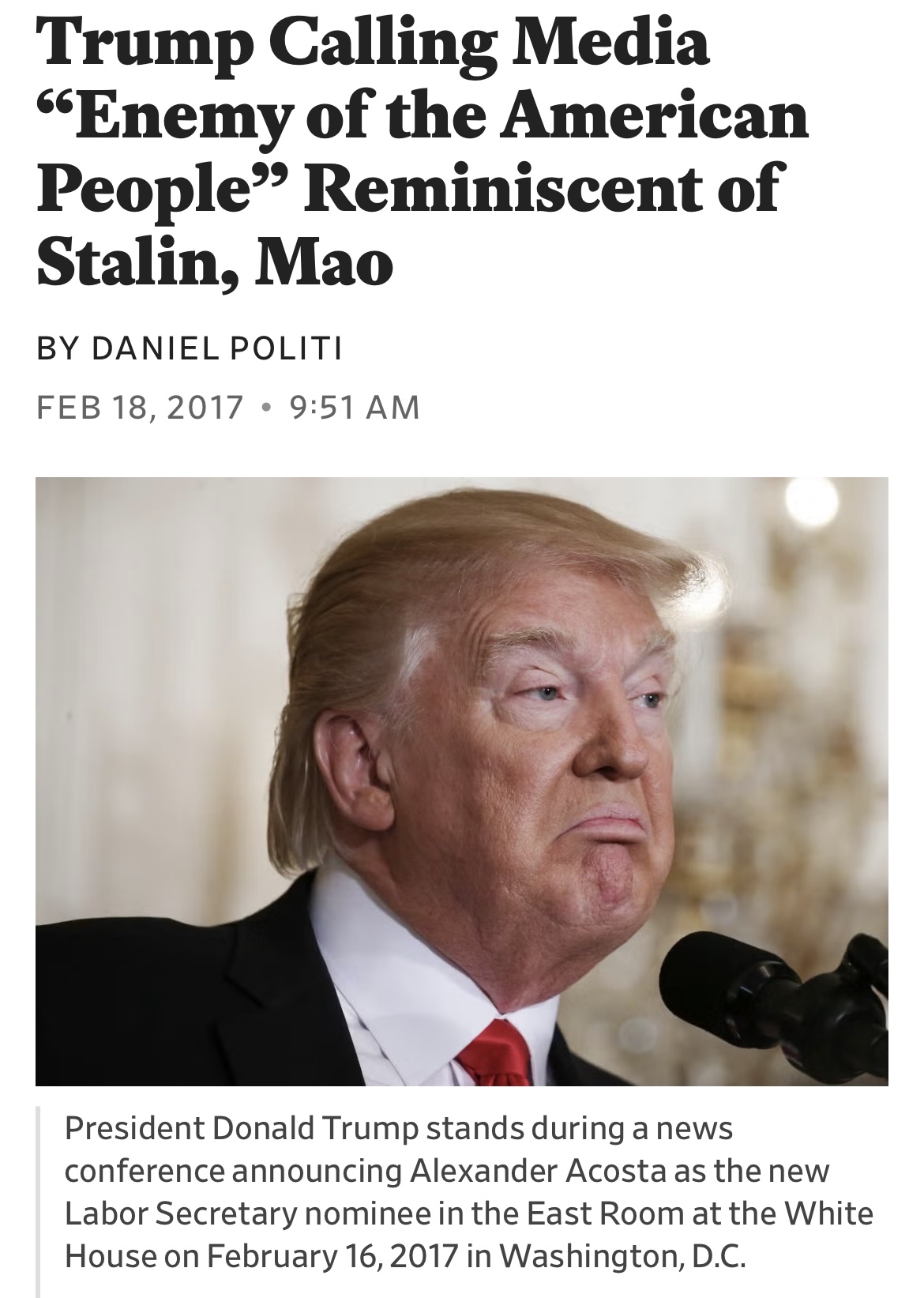 Men vad är det som gör att Trump nu utropats till leninist i Dagens Nyheter? Enligt Ingrid Carlberg är det hans hårda retorik mot amerikanska medier och stämpeln att vissa medier är ”enemy of the American people” – fiender till det amerikanska folket. Det är tillräckligt likt ”folkfiender” som använts i diverse diktaturer genom historien.